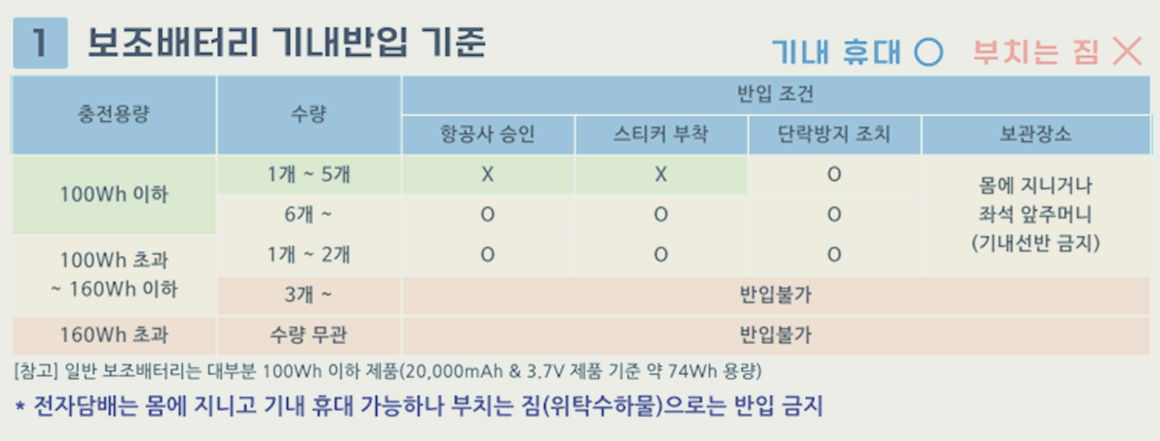 - 보조배터리의 기내 반입 기준은 배터리 전력량(Wh)에 따라 다르며, 초과 반입 시 항공사의 별도 승인절차(체크인카운터에서 신청)를 반드시 거쳐야 함