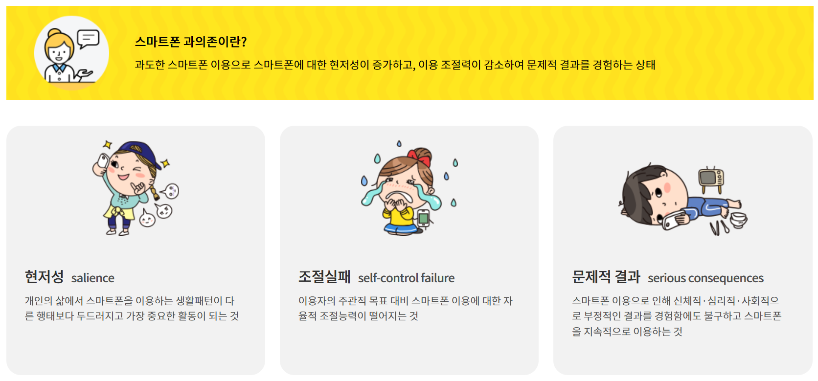 스마트폰 과의존은 다음과 같은 세 가지 특성을 기준으로 정의되며, 세 가지 특성을 모두 보이면 고위험군, 두 가지 이하를 보이면 잠재적 위험군, 특성이 없으면 일반 사용자군으로 분류