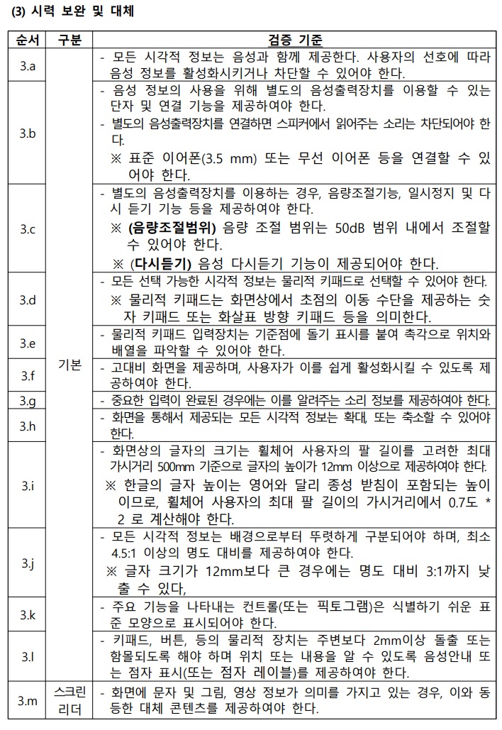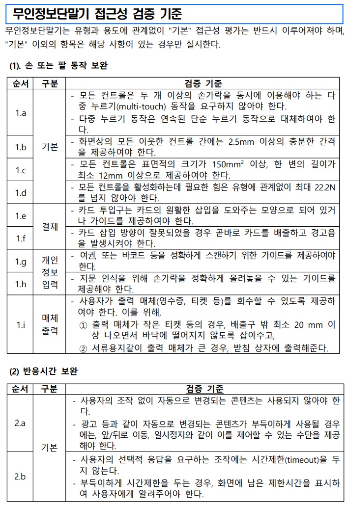 - 키오스크는 과학기술정보통신부 관련 고시*에 따른 접근성 검증기준을 준수한 제품으로, 장애 유형에 따른 불편 사항을 고려한 정당한 편의가 제공되도록 설치·운영되어야 한다.